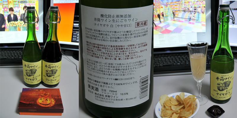 このワインはね、「生(き)ワイン」!純国産の長野県の桔梗ヶ原一帯で収穫されたぶどうを使用して醸造するワインメーカー「井筒ワイン」の生ワインなの。年々着々と熱狂的なファンが増え、10月下旬には某超人気女優がTVで井筒ワインの「ナイアガラ」についてコメントしたことで人気爆発してしまったというワイン。