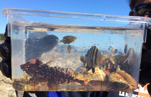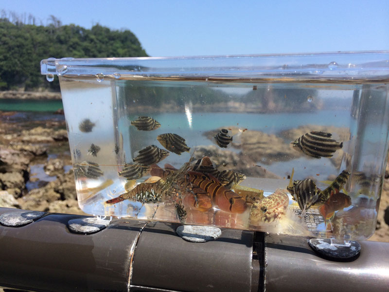 実はまだ、熱帯魚を捕るには時期が早い。あと1ヶ月経過すれば、キレイな南国の魚がバンバンなんだけどね。下田にいる熱帯魚はね、本来は、南国の魚。黒潮に乗って南の海から流されてくるんだけど、その流されてきた親魚が、下田で産卵する、その産卵した小さい子魚を狙うんだけど、これらの魚は、人間に捕られないでそのまま海にいると、冬の寒さに耐えられなくて、死んでしまうという通称「死滅回遊魚」となる。だから、水槽に入れて大事に飼育してあげれば良いことをしているのかもしれないね